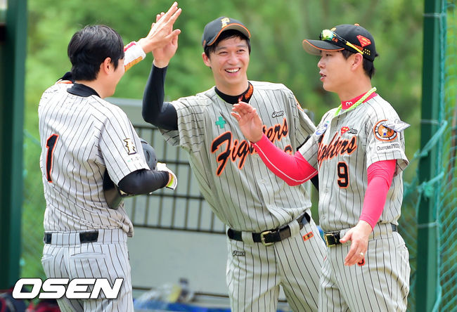 8일 경기도 양평군 오건면 신복리 양평구장에서 진행된 '제5회 니베아맨 컵 전국 생활체육인 야구대회' 아이언 슬러거와 풍산 화이터스의 경기, 1회말 1사 1루 풍산 김정민이 선취 2점 홈런을 날리고 동료들의 축하를 받고 있다.