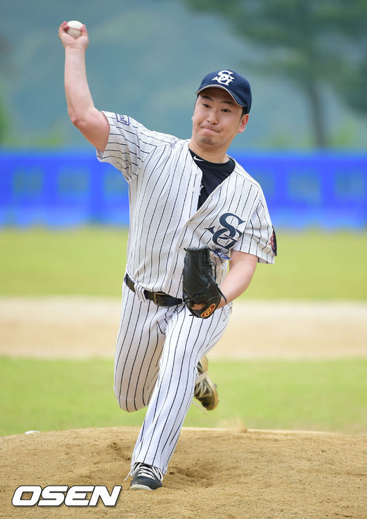 8일 경기도 양평군 오건면 신복리 양평구장에서 진행된 '제5회 니베아맨 컵 전국 생활체육인 야구대회' 아이언 슬러거와 풍산 화이터스의 경기, 1회말 아이언슬러거 선발투수 김현기가 역투하고 있다.