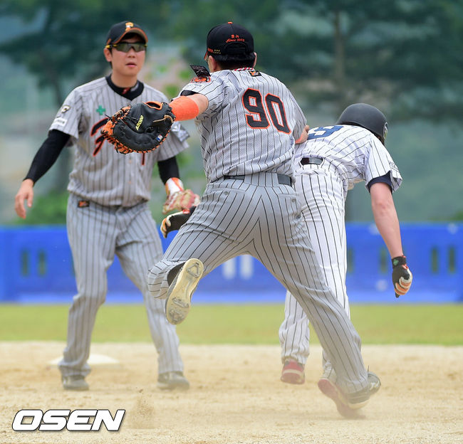 8일 경기도 양평군 오건면 신복리 양평구장에서 진행된 '제5회 니베아맨 컵 전국 생활체육인 야구대회' 아이언 슬러거와 풍산 화이터스의 경기,3회초 무사 1루 아이언 슬러거 정창구가 협살에 걸려 아웃되고 있다.