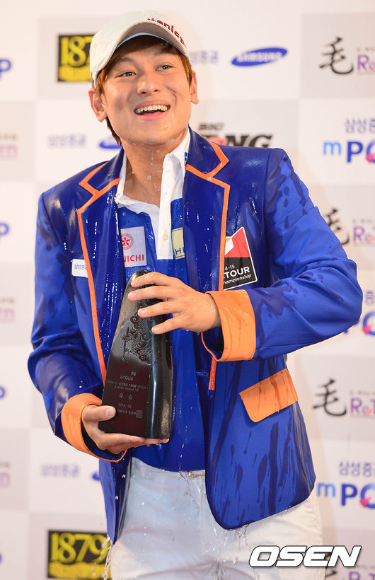 우승을 거머쥔 전윤철 프로가 시상식 중 동료들에게 물세례를 받고 환하게 미소짓고 있다.