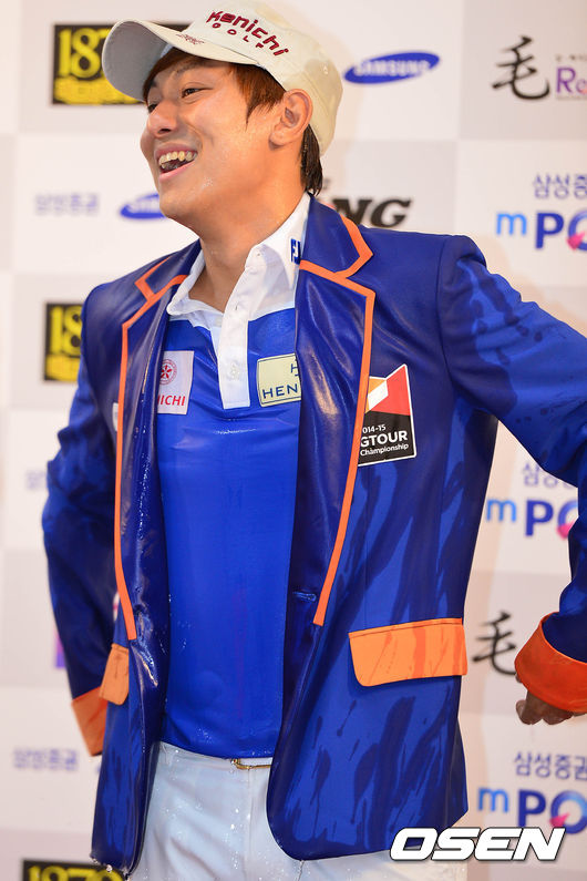 우승을 거머쥔 전윤철 프로가 시상식 중 동료들에게 물세례를 받고 환하게 미소짓고 있다.