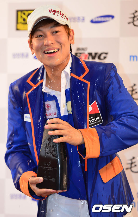 우승을 거머쥔 전윤철 프로가 시상식 중 동료들에게 물세례를 받고 환하게 미소짓고 있다.