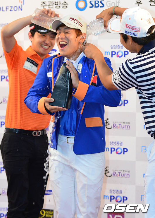 우승을 거머쥔 전윤철 프로가 시상식 중 동료들에게 물세례를 받고 있다.