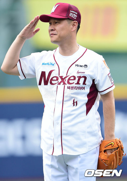 지난 2002년 제2연평해전에서 충무무공훈장을 수상한 이희완 소령이 호국보훈의 달을 맞이해 시구를 마친 뒤 경례로 인사하고 있다.