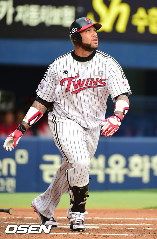 8일 오후 서울 잠실구장에서 열린 2014 한국야쿠르트 세븐 프로야구' LG 트윈스와 KIA 타이거즈의 경기, 1회말 2사 1,2루 LG 조쉬벨이 3점 홈런을 날리고 타구를 바라보고 있다.