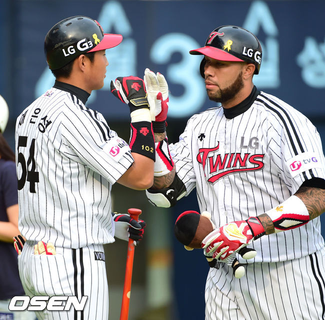 8일 오후 서울 잠실구장에서 열린 2014 한국야쿠르트 세븐 프로야구' LG 트윈스와 KIA 타이거즈의 경기, 1회말 2사 1,2루 LG 조쉬벨이 3점 홈런을 날리고 채은성과 하이파이브를 하고 있다.