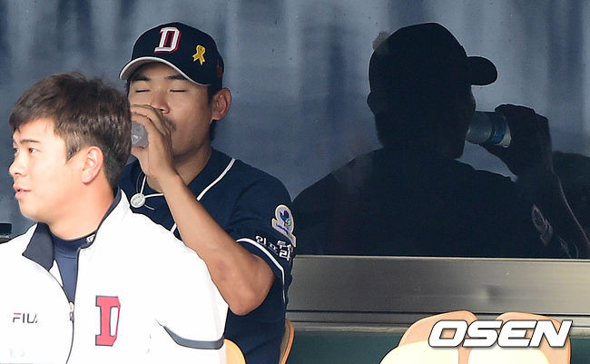 1회초 넥센 공격 2사 만루 상황 박동원에게 밀어내기 볼넷을 허용한 두산 선발 노경은이 마운드를 내려간 뒤 더그아웃에서 물을 마시고 있다.