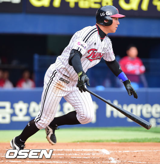 8일 오후 서울 잠실구장에서 열린 2014 한국야쿠르트 세븐 프로야구' LG 트윈스와 KIA 타이거즈의 경기, 2회말 1사 1,2루 LG 오지환이 1타점 적시타를 날리고 있다.