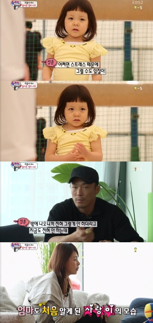8일 방송된 KBS 2TV 예능프로그램 '해피선데이 슈퍼맨이 돌아왔다'에서는 이휘재와 아들 서언 서준, 타블로와 딸 하루, 장현성과 아들 준우 준서, 김정태와 아들 지후, 추성훈과 딸 사랑의 모습이 그려졌다.