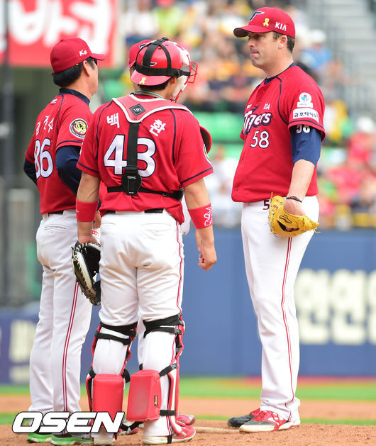 8일 오후 서울 잠실구장에서 열린 2014 한국야쿠르트 세븐 프로야구' LG 트윈스와 KIA 타이거즈의 경기, 2회말 KIA 김정수 투수코치가 마운드에 올라 선발투수 홀튼과 이야기를 나누고 있다.