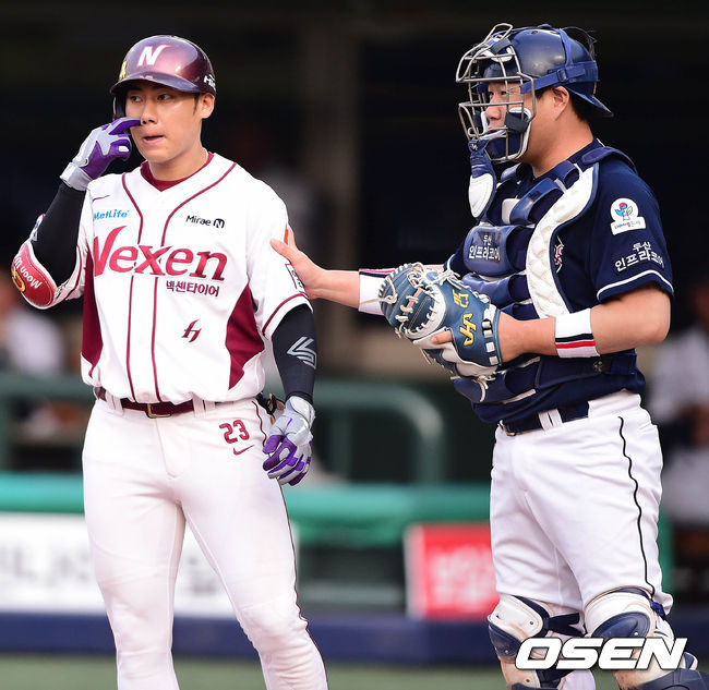 3회말 넥센 공격 2사 주자없는 상황 문우람이 좌중간 펜스사이에 공이 끼이는 2루타를 날린 뒤 홈까지 뛰었다. 인정 2루타 판정이 이뤄진 뒤 두산 포수 양의지가 문우람에게 2루에 가라는 제스처를 취하고 있다.