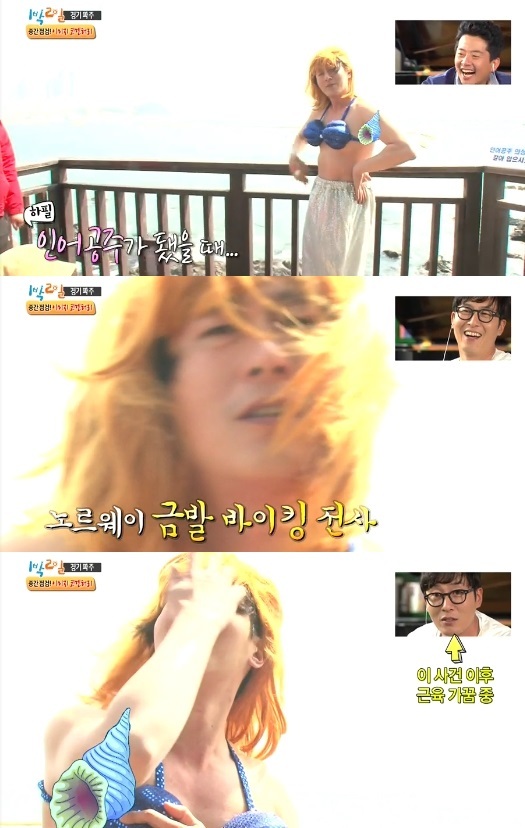 이날 김주혁은 자신이 해운대에서 인어공주 의상 벌칙을 당했던 영상이 나오자 "아 더러워"라고 자책했다.