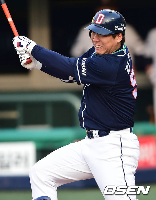 4회초 두산 공격 선두타자로 나선 김현수가 추격의 좌중간 솔로포를 날리고 있다.
