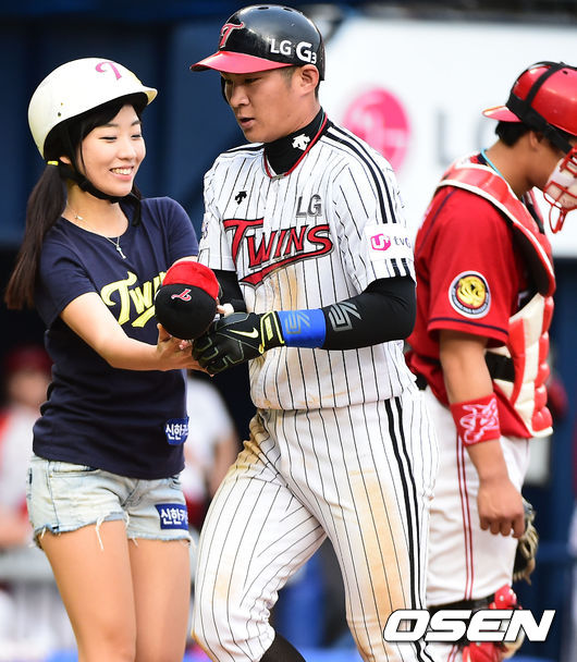 8일 오후 서울 잠실구장에서 열린 2014 한국야쿠르트 세븐 프로야구' LG 트윈스와 KIA 타이거즈의 경기, 4회말 2사 2루 LG 오지환이 2점 홈런을 날리고 배트걸에게 인형을 선물받고 있다.