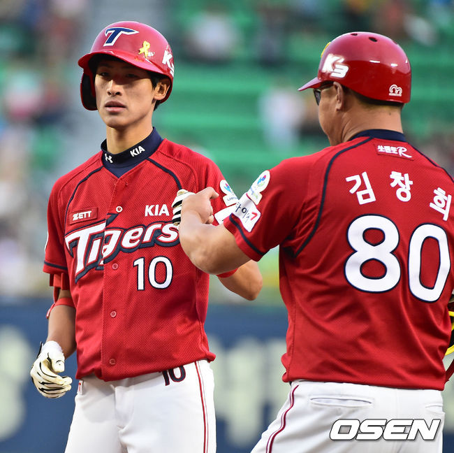 8일 오후 서울 잠실구장에서 열린 2014 한국야쿠르트 세븐 프로야구' LG 트윈스와 KIA 타이거즈의 경기, 6회초 2사 1,2루 KIA 강한울이 1타점 적시타를 날린후 김창희 코치와 하이파이브를 하고 있다.