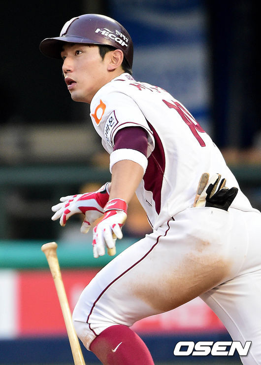5회말 넥센 공격 1사 2루 상황 서건창이 좌전안타를 날리고 있다. 5회 현재 4안타.