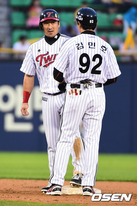8일 오후 서울 잠실구장에서 열린 2014 한국야쿠르트 세븐 프로야구' LG 트윈스와 KIA 타이거즈의 경기, 6회말 2사 만루 LG 이병규가 3타점 2루타를 날리고 김민호 코치와 이야기를 하고 있다.