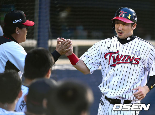 8일 오후 서울 잠실구장에서 열린 2014 한국야쿠르트 세븐 프로야구' LG 트윈스와 KIA 타이거즈의 경기, 6회말 2사 2루 LG 채은성의 1타점 적시타때 홈을 밟은 이병규가 동료들의 축하를 받고 있다. 이병규는 6회말까지 5타수 5안타 6타점을 기록하고 있다.