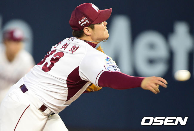 6회초 두산 공격 1사 1루 상황 마운드에 오른 넥센 투수 한현희가 힘차게 공을 뿌리고 있다.