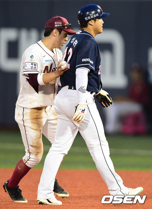 6회초 두산 공격 1사 1루 상황 양의지가 삼진을 당하는 순간 2루 도루를 시도한 홍성흔이 넥센 2루수 서건창의 태그에 걸려 아웃되고 있다.