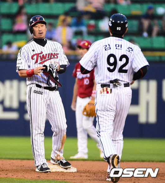 8일 오후 서울 잠실구장에서 열린 2014 한국야쿠르트 세븐 프로야구' LG 트윈스와 KIA 타이거즈의 경기, 6회말 2사 만루 LG 이병규가 3타점 2루타를 날리고 타임을 요청하고 있다. 이병규는 5타수 5안타 6타점, 7회말 현재 사이클링 히트에 홈런 하나만 남겨두고 있다.
