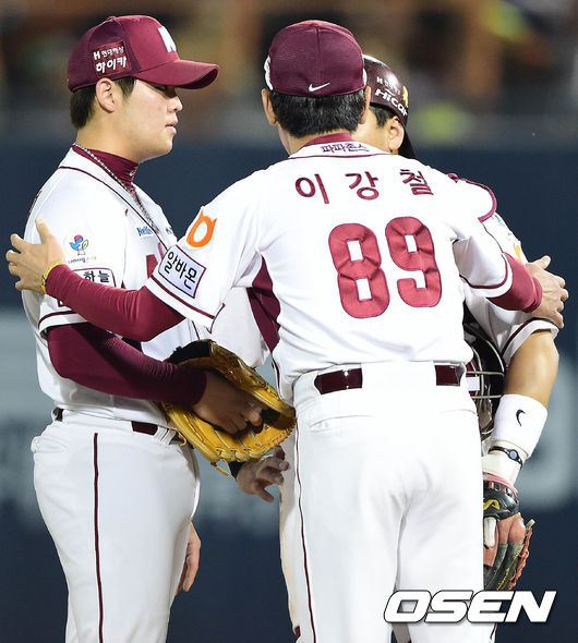 8회초 두산 공격 1사 1, 2루 상황 넥센 이강철 코치가 마운드에 올라 투수 한현희, 포수 허도환과 대화를 나누고 있다.