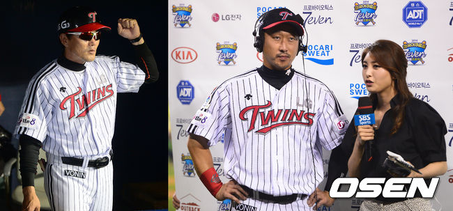 경기종료 후 LG 김민호 코치가 맹활약 펼치며 인터뷰하는 이병규를 향해 응원을 펼치고 있다. / soul1014@osen.co.kr