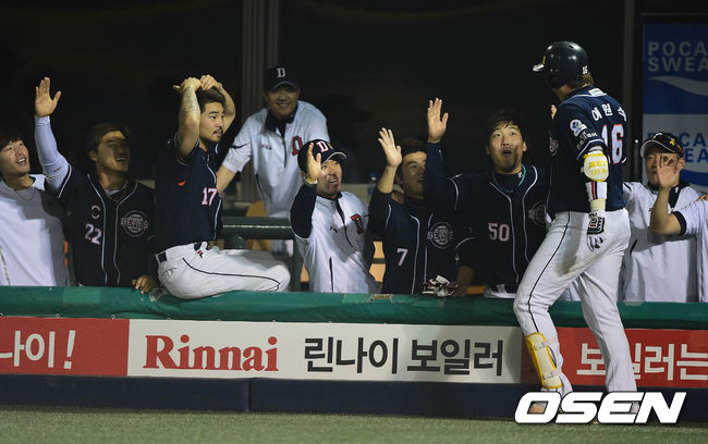 9회초 두산 공격 무사 1, 2루 상황 대타 이원석이 동점 좌월 스리런포를 날리고 홈을 밟은 뒤 더그아웃 동료들과 인사를 나누고 있다.