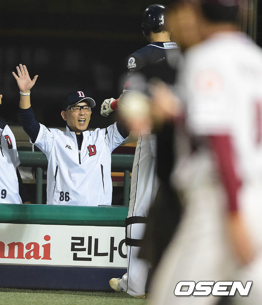 9회초 두산 공격 2사 3루 상황 칸투가 쐐기 좌월 투런포를 날리고 홈으로 들어오는 가운데 송일수 감독이 두 손을 번쩍 들며 환호하고 있다.