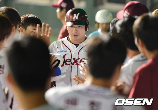 9회말 넥센 공격 선두타자로 나선 박병호가 추격의 좌월 솔로포를 날리고 더그아웃 동료들과 인사를 나누고 있다.