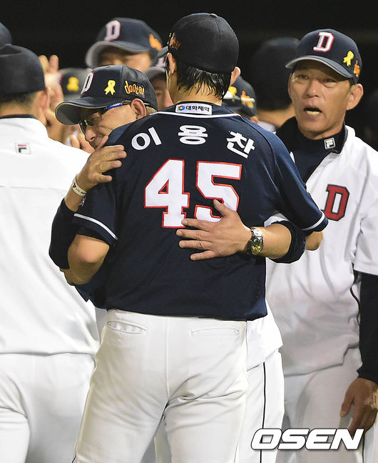 경기를 마무리지은 두산 투수 이용찬과 송일수 감독이 인사를 나누고 있다./dreamer@osen.co.kr