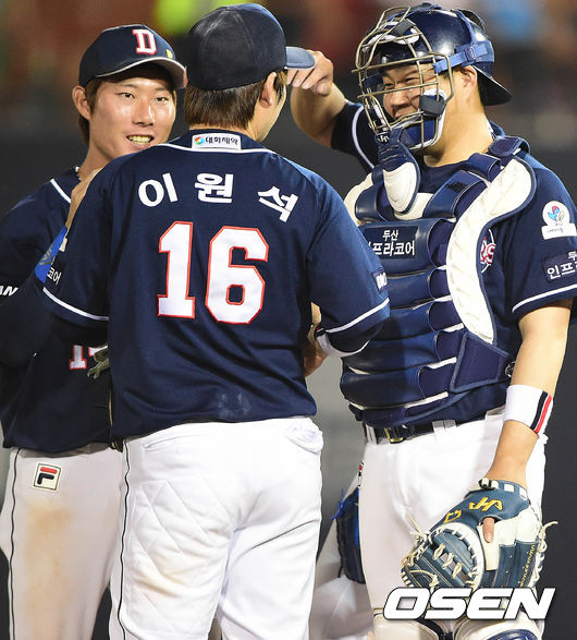 경기 종료 직후 9회 극적인 동점 스리런을 날린 두산 이원석과 고영민-양의지가 인사를 나누고 있다./dreamer@osen.co.kr