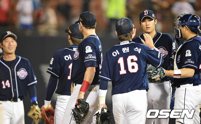 두산 선수들이 마운드에서 하이파이브를 나누고 있다./dreamer@osen.co.kr