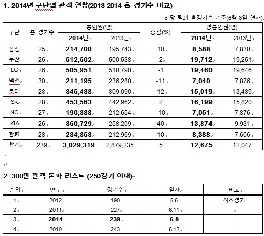 2014 한국야쿠르트 세븐 프로야구가 8일 239경기 만에 300만 관중을 돌파했다.