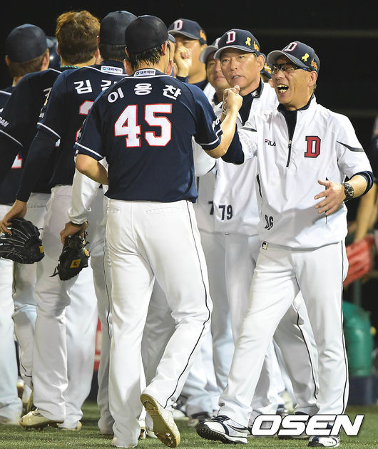 경기를 마무리지은 두산 투수 이용찬과 송일수 감독이 인사를 나누고 있다./dreamer@osen.co.kr