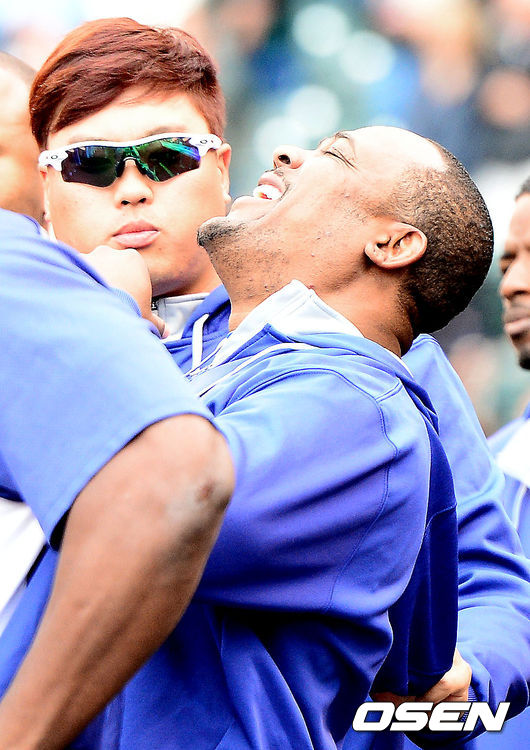 9일 새벽(한국시간) 미국 콜로라도주 덴버 쿠어스필드에서 열린 '2014 메이저리그' 미국 메이저리그 콜로라도 로키스와 LA 다저스의 경기, 류현진이 유리베의 모자를 잡아당기며 장난을 치고 있다.
