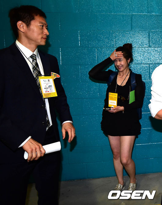 9일 오전(이하 한국시간) 미국 플로리다주 마이애미 선라이프 스타디움에서 열린 대표팀 기자회견에 김남일과 김보민 부부가 참석하고 있다.