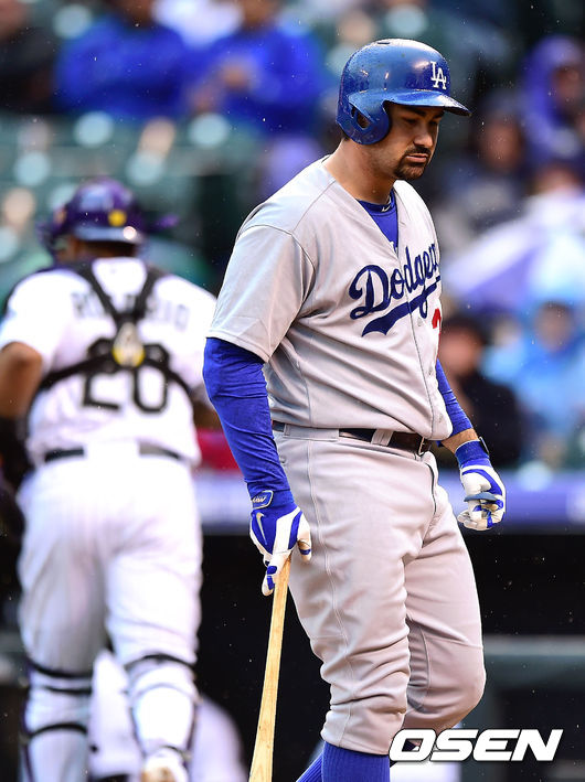 9일 새벽(한국시간) 미국 콜로라도주 덴버 쿠어스필드에서 열린 '2014 메이저리그' 미국 메이저리그 콜로라도 로키스와 LA 다저스의 경기, 3회초 2사 LA 다저스 곤잘레스가 삼진을 당한 뒤 더그아웃으로 들어가고 있다.