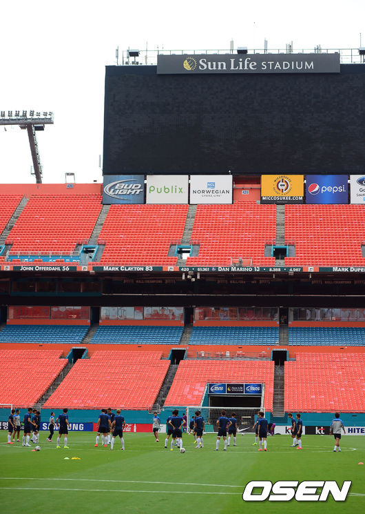9일 오전(이하 한국시간) 미국 플로리다주 마이애미 선라이프 스타디움에서 열린 대표팀 훈련에서 선수들이 몸을 풀고 있다.