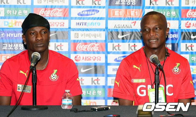 9일 오전(이하 한국시간) 미국 플로리다주 마이애미 선라이프 스타디움에서 열린 가나 대표팀 기자회견에서 크와시 아피아 감독(오른쪽)과 아사모아 기안이 취재진들의 질문에 답하고 있다.