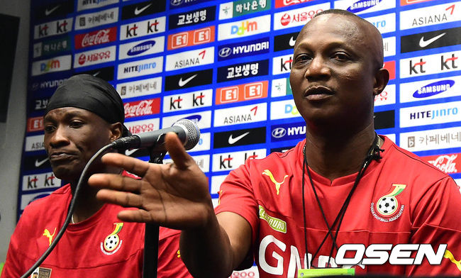 9일 오전(이하 한국시간) 미국 플로리다주 마이애미 선라이프 스타디움에서 열린 가나 대표팀 기자회견에서 크와시 아피아 감독(오른쪽)과 아사모아 기안이 취재진들의 질문에 답하고 있다.