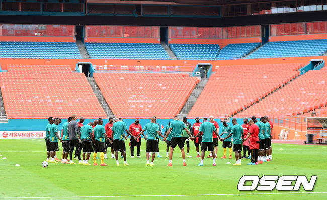 가나 대표팀 선수들이 9일 오전(이하 한국시간) 미국 플로리다주 마이애미 선라이프 스타디움에서 열린 훈련 시작전 모여 있다.