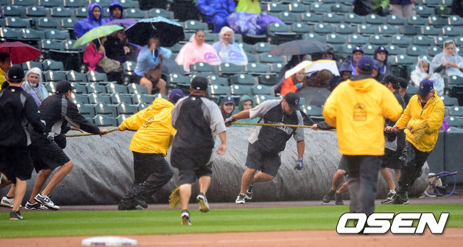 9일 새벽(한국시간) 미국 콜로라도주 덴버 쿠어스필드에서 열린 '2014 메이저리그' 미국 메이저리그 콜로라도 로키스와 LA 다저스의 경기, 6회말 시작전 많은 비로 인해 경기가 중단되자 방수포를 덮고 있다.