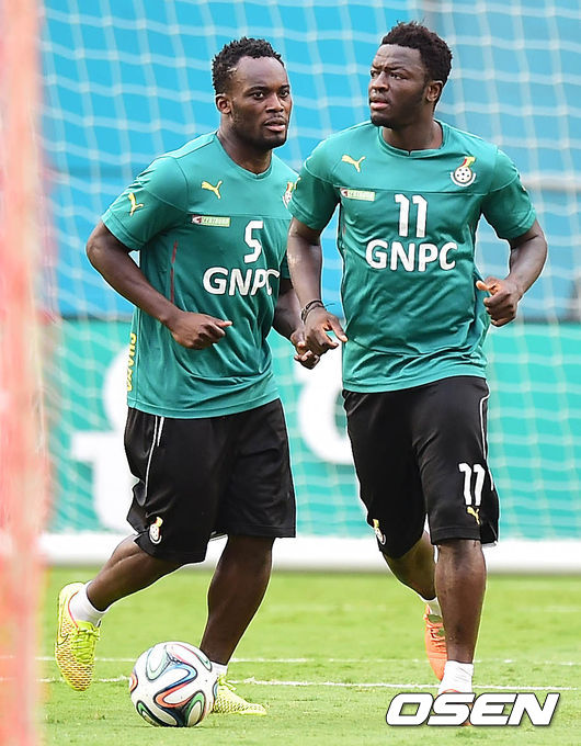9일 오전(이하 한국시간) 미국 플로리다주 마이애미 선라이프 스타디움에서 열린 가나 대표팀 훈련에서 설리 문타리(오른쪽)와 마이클 에시엔이 몸을 풀고 있다.