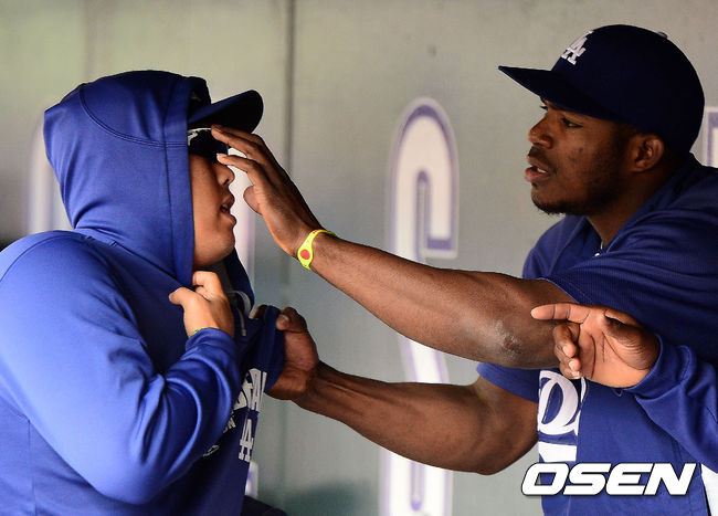 9일 새벽(한국시간) 미국 콜로라도주 덴버 쿠어스필드에서 열린 '2014 메이저리그' 미국 메이저리그 콜로라도 로키스와 LA 다저스의 경기 시작전 푸이그와 류현진이 장난을 치고 있다.
