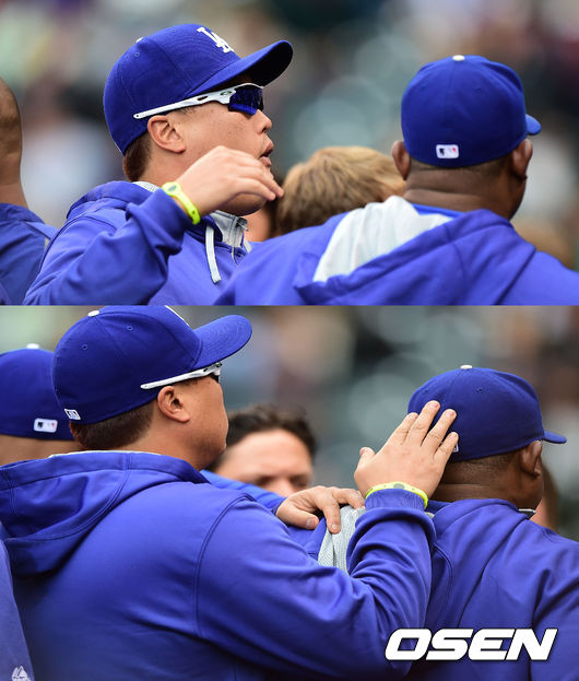 9일 새벽(한국시간) 미국 콜로라도주 덴버 쿠어스필드에서 열린 '2014 메이저리그' 미국 메이저리그 콜로라도 로키스와 LA 다저스의 경기전 LA 다저스 류현진이 유리베에게 장난을 치고 있다.