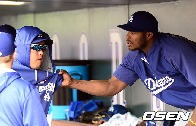 9일 새벽(한국시간) 미국 콜로라도주 덴버 쿠어스필드에서 열린 '2014 메이저리그' 미국 메이저리그 콜로라도 로키스와 LA 다저스의 경기, LA 다저스 푸이그가 류현진에게 장난을 치고 있다.