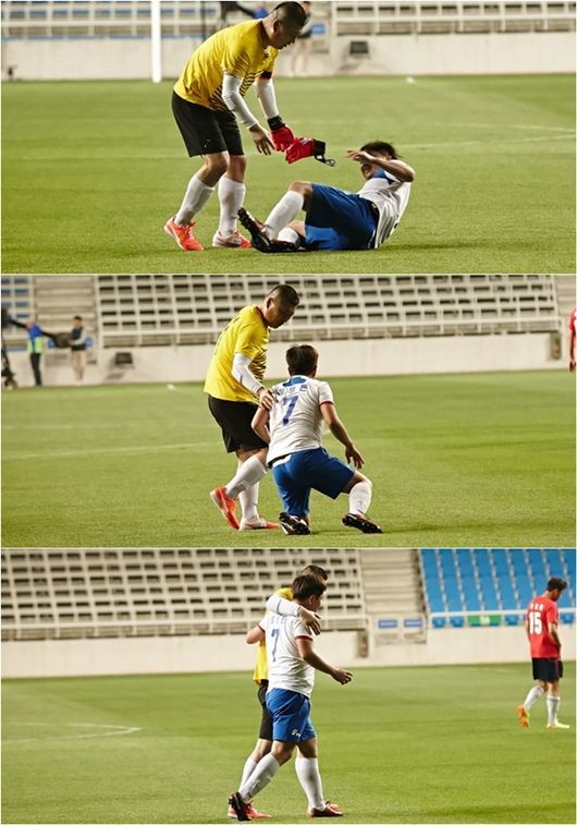 오는 10일 방송될 '예체능' 58회는 노련미 넘치는 '월드컵 레전드'와 어디로 튈지 모르는 '우리동네 FC'와의 한 치의 물러섬도 없는 진검승부가 펼쳐질 예정. 방송에 앞서 공개된 스틸 속 강호동은 그라운드에 쓰러져있는 정형돈을 향해 매너손을 발휘하고 있다. 이에, 두 사람은 마치 친형제를 연상케 하는 넉넉한 풍채와 푸근한 분위기로 보는 이들의 입가에 미소를 머금게 한다.