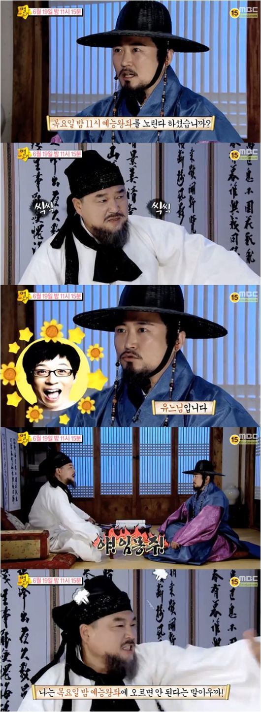임호는 “대감께서 아무리 이래도 유느님 이기기 어렵다”고 냉철하게 지적했고, 이에 강호동이 분노해 상을 뒤엎는 ‘정도전’ 속 장면을 패러디했다.