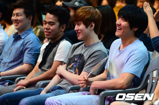 9일 서울 용산 스포츠 온게임넷 상설경기장에서 진행된 '콩두스타즈파티'에서 박정석과 김택용 염보성이 경기장을 찾아 관전하고 있다.